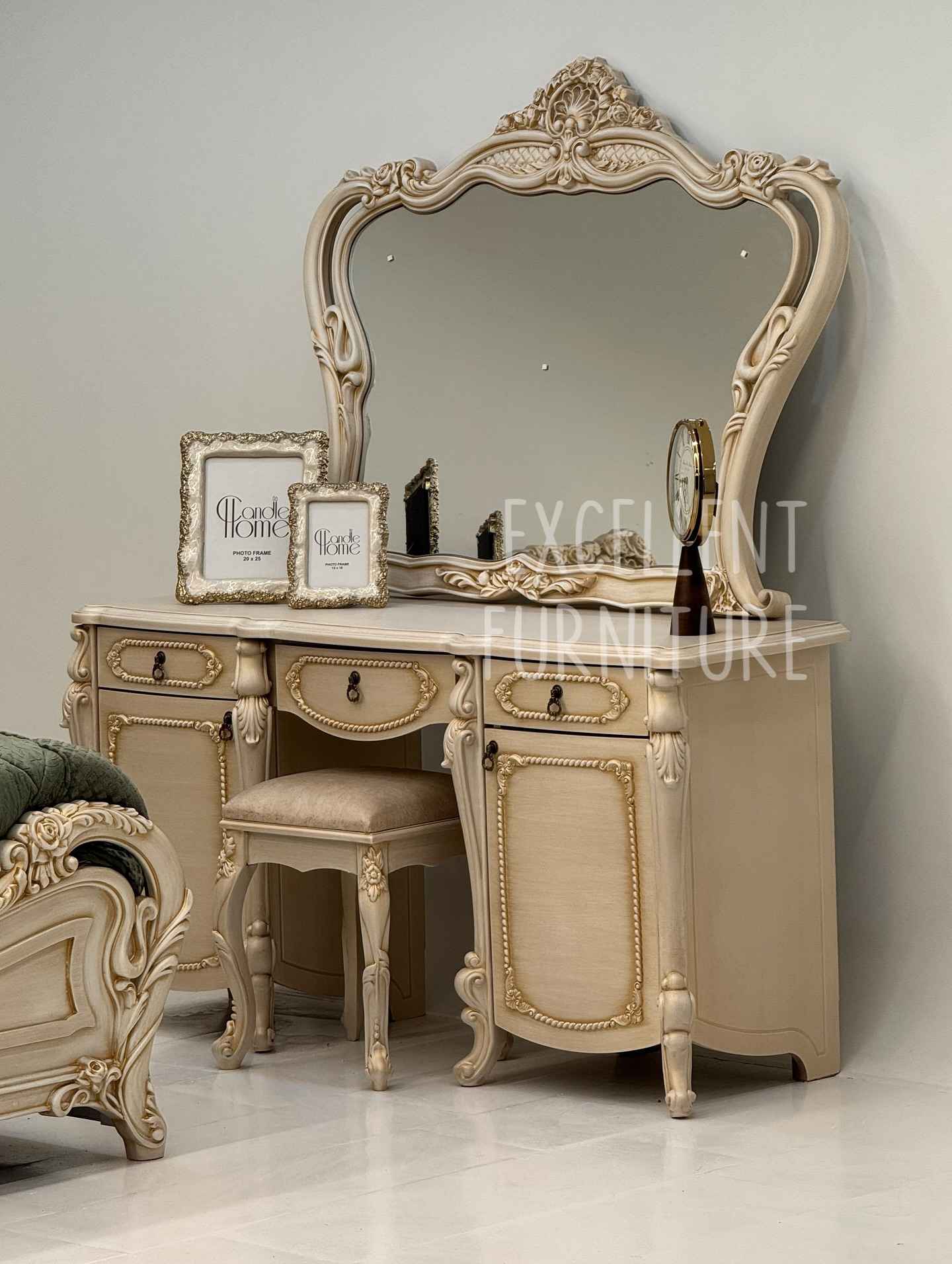 Along with its elegance, the Royal Wooden Bedroom Set offers smart storage solutions. The side tables and dresser come with smooth drawers, giving you ample space to organize daily essentials. The ergonomic design ensures comfort, while the quality fittings guarantee smooth usability.